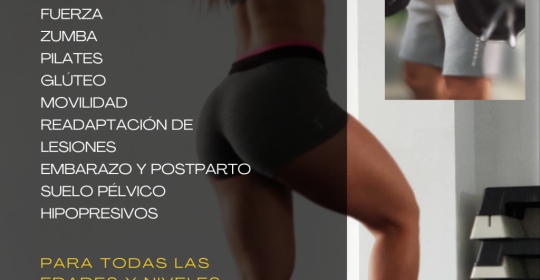 Entrenamiento personal individual y en grupo reducido. Entrenamiento de fuerza, resistencia... Entrenamiento durante el embarazo y post parto. Suelo pélvico e hipopresivos. Recuperación de lesiones. Movilidad. Actividades dirigidas.